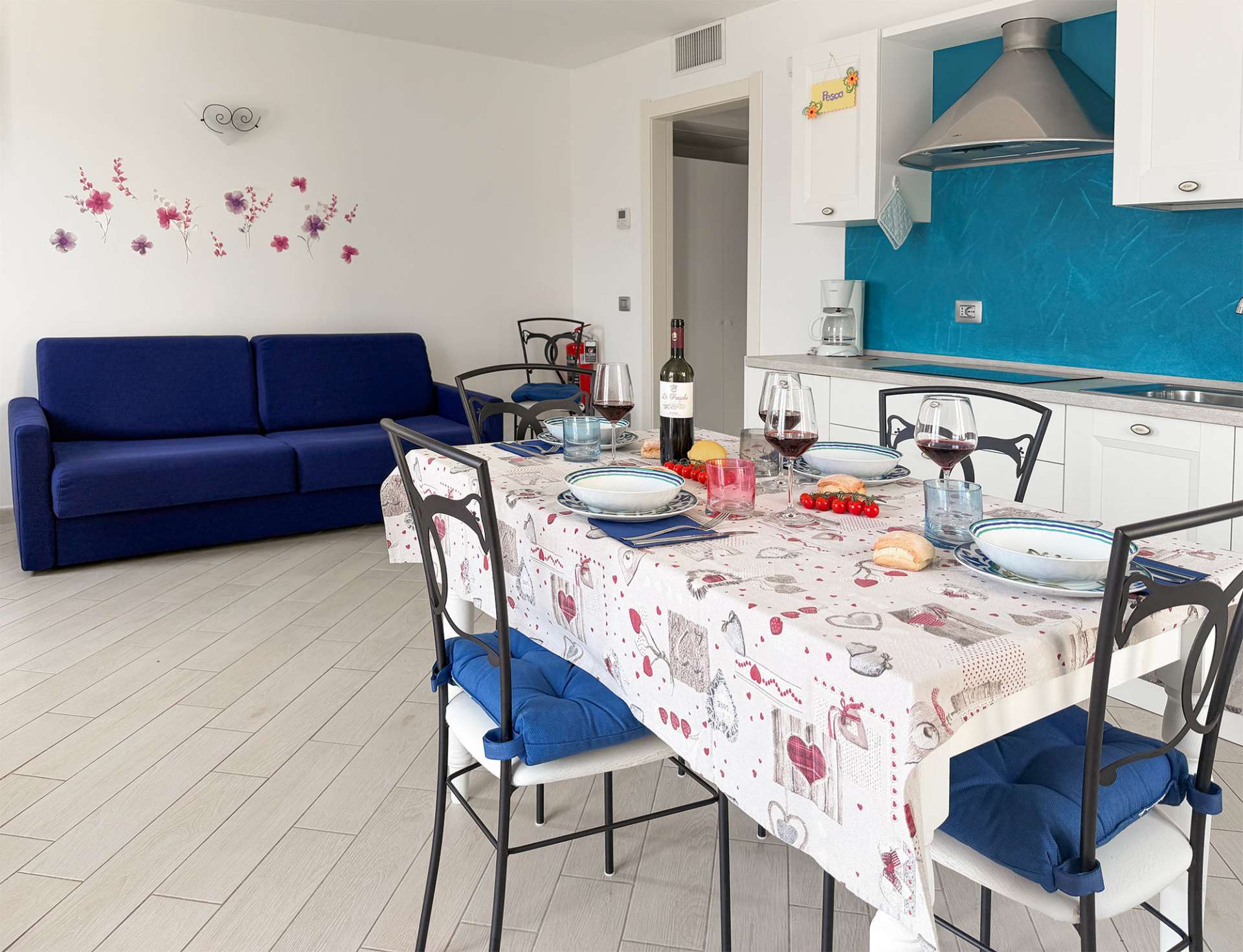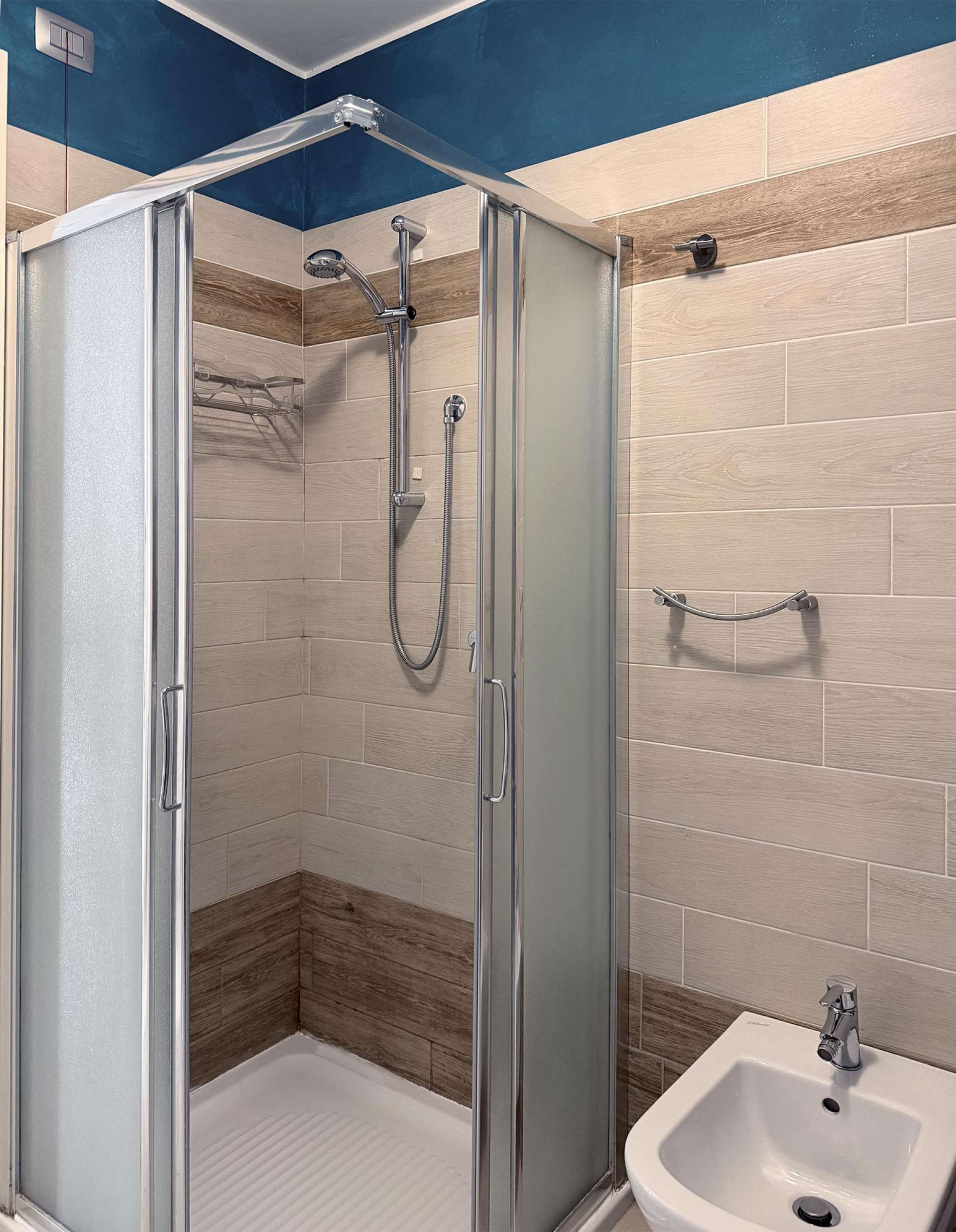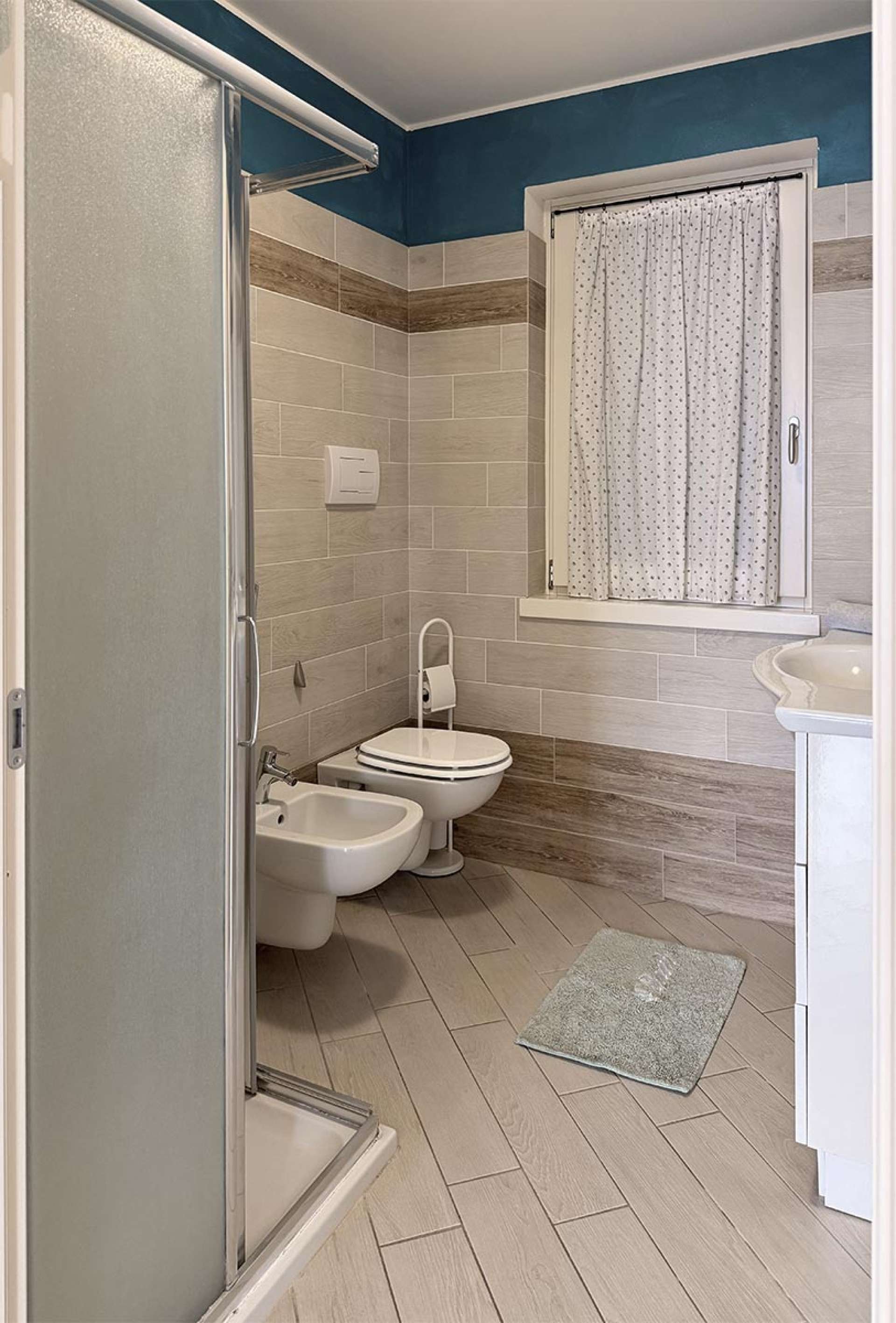 Ampio soggiorno con angolo cucina, divano letto, camera matrimoniale bagno con doccia dai toni pesca.