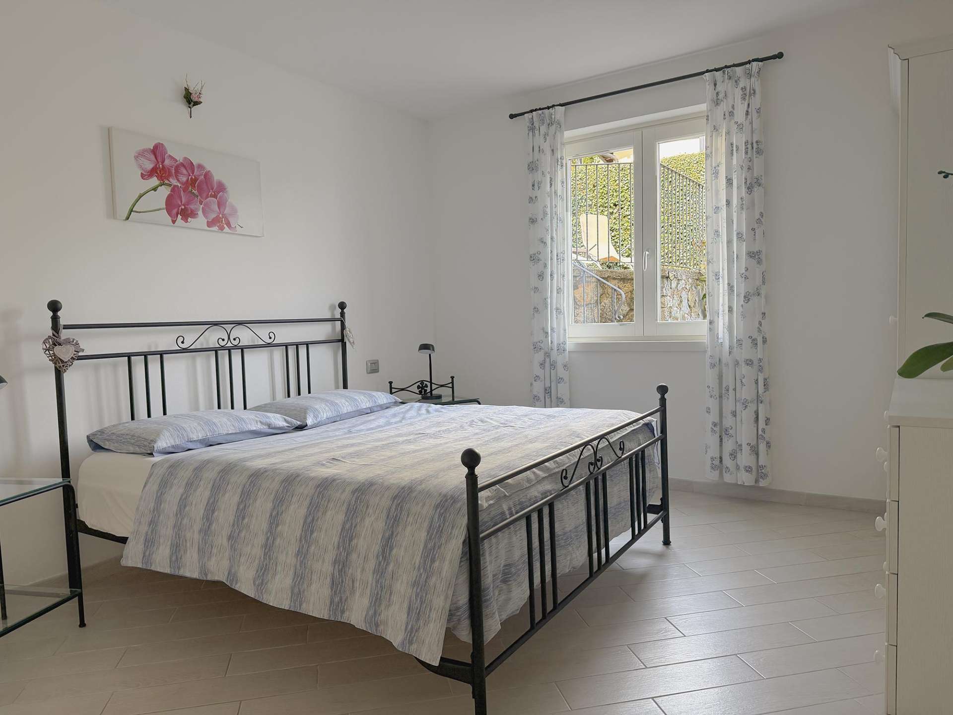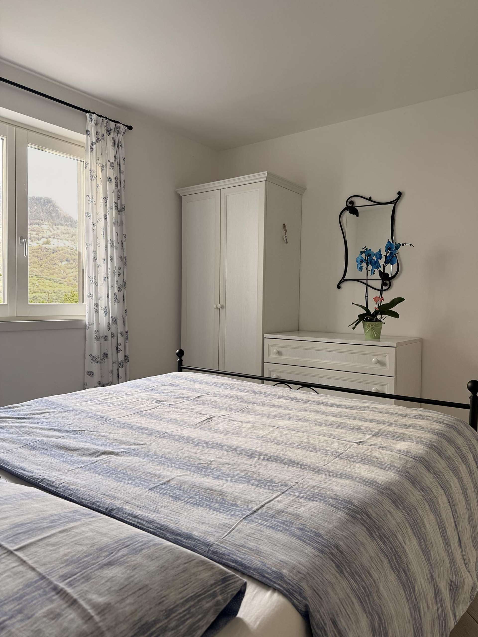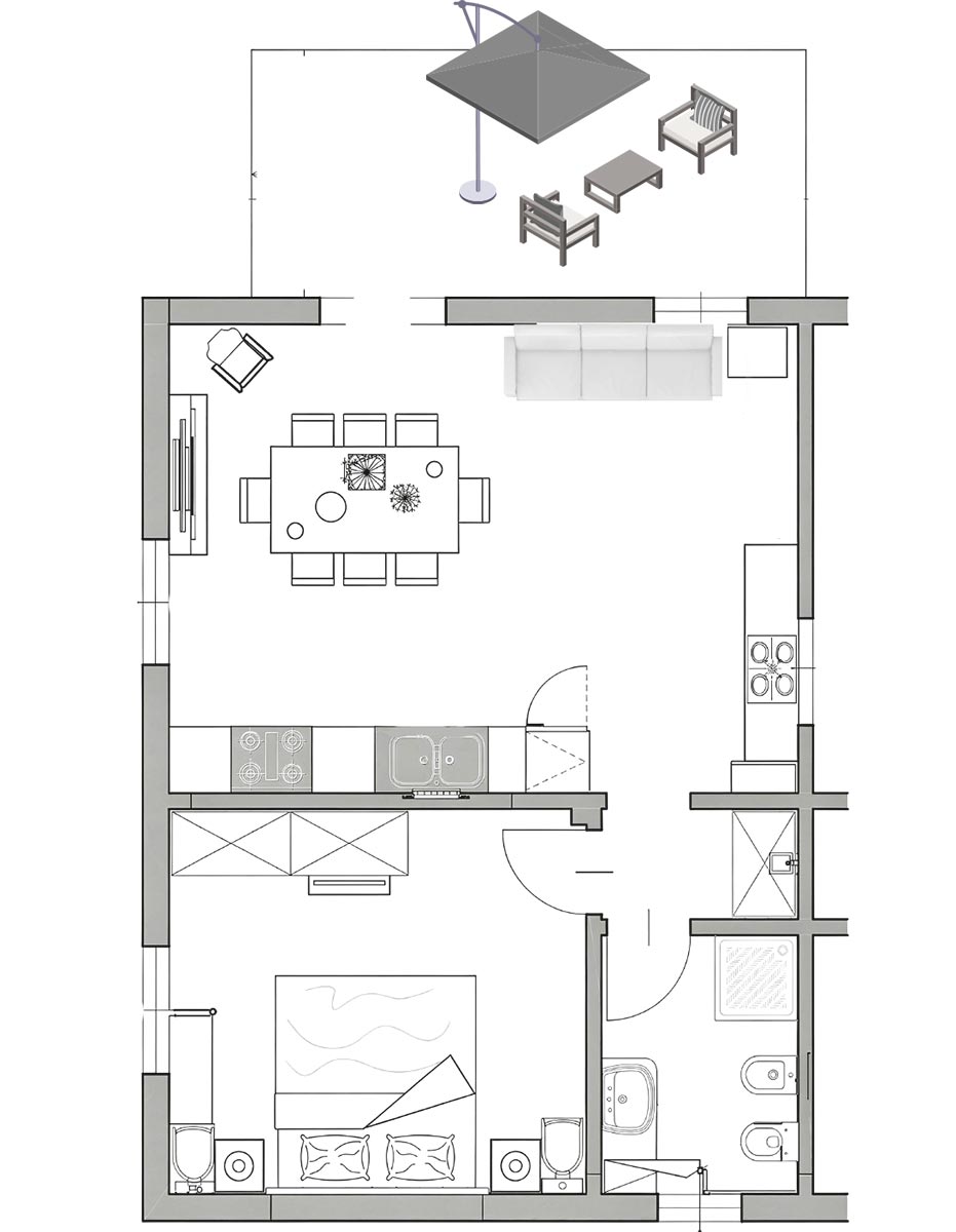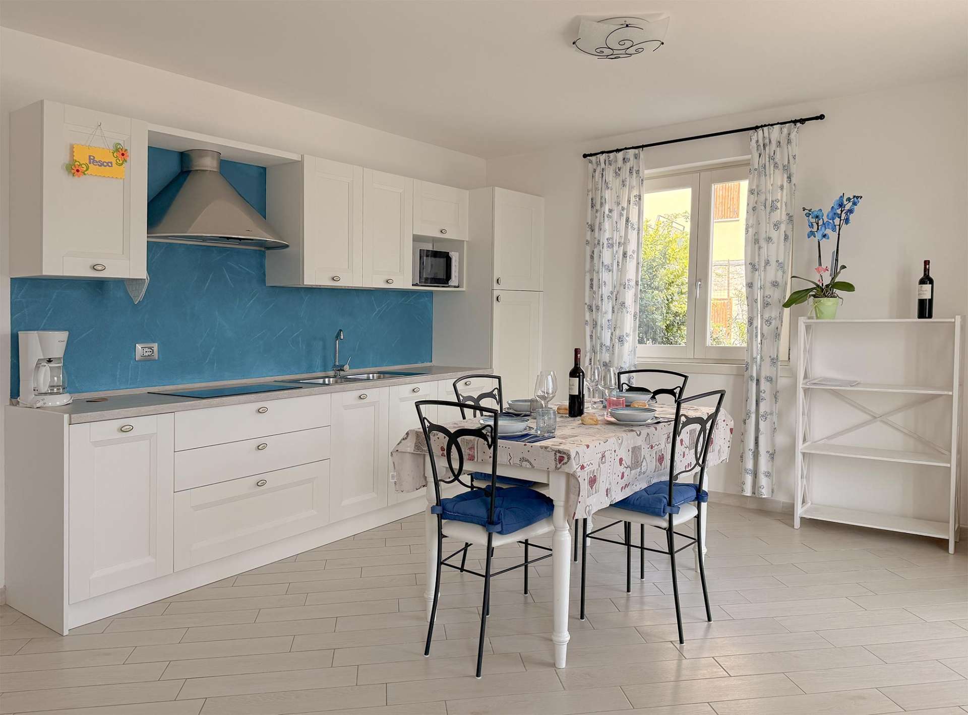 Ampio soggiorno con angolo cucina, divano letto, camera matrimoniale bagno con doccia dai toni pesca.
